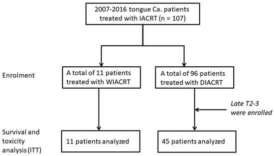 This retrospective observational cohort study was performed in patients with tongue cancer (the anterior 2/3 of the tongue) treated with DIACRT or WIACRT at Yokohama City University Hospital (n = 107). In our institution, IACRT is performed for patients who refused surgery and WIACRT is performed for late T2 (measuring > 3 cm) and T3 patients, and DIACRT for late T2–T4 paients, especially for cases where the tumor invades the adjacent organ (buccal mucosa, floor of mouth, and lower gingiva) of the tongue. Between January 2007 and December 2016, a total of 11 patients were treated with WIACRT and 96 were treated with DIACRT. All 11 patients treated with WIACRT were enrolled in the present study. In the 96 patients treated with DIACRT, 45 patients had late T2-3 and 51 had T4a-4b. To assess the comparability of the two groups, a total of 45 patients with late T2-3 in the DIACRT group were enrolled in the present study. As a result, the 1:4 matched groups were created from the 96 patients treated with DIACRT to enhance the quality of statistical results [7]. A flowchart of the study design is shown in Figure 1. Specific inclusion criteria were as follows: ≥20 but <90 years of age; Eastern Cooperative Oncology Group performance status (ECOG-PS) of 0 or 1; pathological confirmation of squamous cell carcinoma of the tongue, with any tumor differentiation; adequate hematologic, hepatic, and renal functions (white blood cells, >3000/μL; neutrophils, >2000/μL; platelet count, >100,000/μL; hemoglobin, >9 g/dL; AST and ALT, <3 times the normal upper limit; total bilirubin, <1.5 mg/dL; and creatinine clearance, >60 mL/min); and life expectancy of ≥3 months.