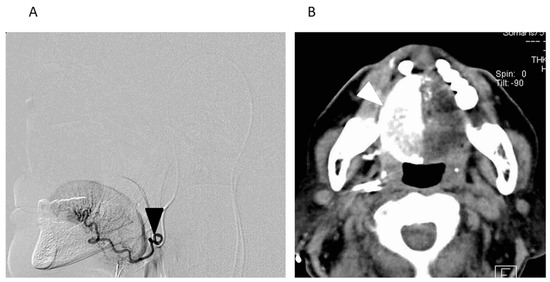 A Digital Subtraction Angiogram (DSA) and an Axial View of the Angio-CT Image through Retrograde Intra-arterial Infusion (Right Tongue Cancer: T3N0M0). (A) A DSA of the right lingual artery (LA). The catheter was selectively inserted into the right LA via the occipital artery (black arrowhead: the tip of the catheter). (B) An axial view of the angio-CT image after the infusion of a small amount of contrast medium through the catheter. Tumor staining of the right side of the tongue is seen through the right LA (white arrowhead).