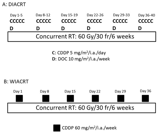 The anticancer agent was injected in a bolus through the intra-arterial catheter concurrent with RT. In the DIACRT group, the total dose of CDDP was 150 mg/m2 (5 mg/m2/day, five times a week for six weeks) and that of DOC was 60 mg/m2 (10 mg/m2/week for six weeks). Sodium thiosulfate (STS) (1 g/m2) was administered intravenously immediately after intra-arterial infusion of CDDP. The DIACRT regimen was determined according to other studies [9,10,11]. In the WIACRT group, CDDP was administered as an intra-arterial infusion at doses of 30–60 mg/m2 once a week for six weeks. STS was also administered intravenously at 2 g/m2 immediately after intra-arterial infusion of CDDP (Figure 3). The weekly CDDP dose of WIACRT was determined according to the study of Fuwa et al. [12].