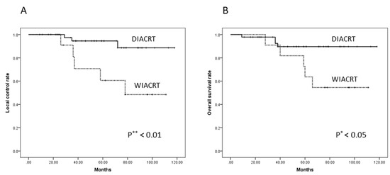 (A) The five-year Local Control (LC) and (B) Overall Survival (OS) Rates of the DIACRT and WIACRT Groups. The five-year LC and OS were 94.5% and 89.6% for the DIACRT group, and 60.6% and 63.6% for the WIACRT group, respectively. The LC and OS rate in the DIACRT group were significantly higher than those in the WIACRT group (p = 0.007 and 0.027, respectively). Abbreviations: OS, overall survival; LC, local control.