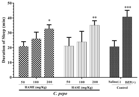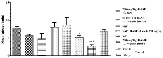 Baradaran Rahimi, V.; Askari, V.R.; Tajani, A.S.; Hosseini, A.; Rakhshandeh, H. Evaluation of the Sleep-Prolonging Effect of Lagenaria vulgaris and Cucurbita pepo Extracts on Pentobarbital-Induced Sleep and Possible Mechanisms of Action. Medicina 2018, 54, 55. https://doi.org/10.3390/medicina54040055