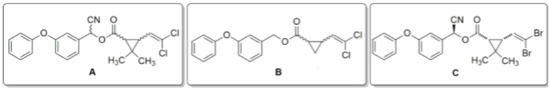 Structure of pyrethroids: (A) permethrin—a mixture of cis- and trans-isomers with a ratio of 1:3, 3-phenoxyphenyl)-methyl] 3-(2,2-dichloroethenyl)cyclopropane-1-carboxylate; (B) deltamethrin [(S)-Cyano-(3-phenoxyphenyl)-methyl] (1R,3R)-3-(2,2-dibromoethenyl)-2,2-dimethylcyclopropane-1-carboxylate; (C) alpha-cypermethrin—a racemic mixture: [(S)-alpha-cyano-(3-phenoxyphenyl)-methyl] (1R,3R)-3-(2,2-dichlorovinyl)-2,2-dimethylcyclopropane-1-carboxylate oraz [(R)-alpha-cyano-(3-phenoxyphenyl)-methyl](1S,3S)-3-(2,2-dichlorovinyl)-2,2-dimethylcyclopropane-1-carboxylate.