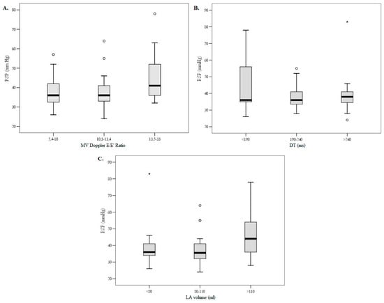 Box-plot of the association of mitral E/E’ ratio (A), deceleration time (B) and left atrial volume (C) by tertiles with PSP. Data are presented as medians (line inside the box), interquartile ranges (IQR) of 25th to 75th percentiles (limits of the box), and 1.5 times IQR above and below the 75th and 25th percentiles (error bars). p < 0.05 across tertiles for all variables (E/E’, DT and LA volume). MV = mitral valve; E/E’ = transmitral flow velocity/mitral annular diastolic velocity ratio; DT = deceleration time; LA = left atrium; PSP = pulmonary systolic pressure.