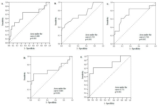 ROC Curve Analysis of E/E’ ratio (A), MV deceleration time (B), left atrial volume (C), NT-proBNP (D) and GDF-15 values (E). Receiver–operating characteristic (ROC) curve analysis of values of echocardiography-derived E/E’ ratio (A), MV deceleration time (B), left atrial volume (C) and biomarker levels ((NT-proBNP (D) and GDF-15 (E) in the prediction of PSP ≥ 45 mmHg.
