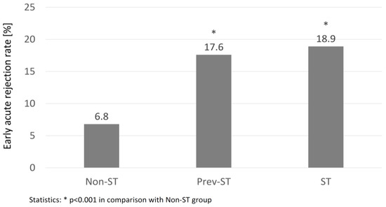 The percentage of early acute rejection episodes in the groups of non-sensitized (Non-ST), previously sensitized (Prev-ST), and sensitized (ST) kidney transplant recipients.
