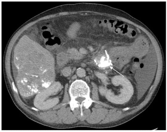 - Akahoshi, T.; Tanoue, K.; Tomikawa, M.; Hashizume, M.; Sugimachi, K. Rupture of jejunal varices treated by percutaneous transhepatic obliteration and endoscopic injection sclerotherapy with N-butyl-2-cyanoacrylate. Endoscopy 2001, 33, 998. [Google Scholar] [CrossRef] [PubMed]