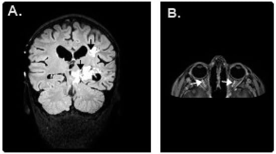 (A) Magnetic resonance image (MRI) of the patient’s brain demonstrating a left brain hemisphere and brainstem glioblastoma; (B) On T1-weighted sequence, after contrast injection, an enhancement of the bilateral optic nerve compatible with optic neuritis.