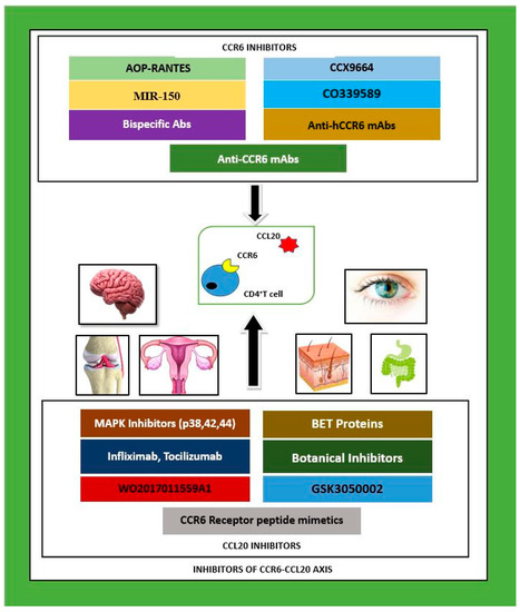 Prototypical functions of the chemokine receptor CCR6 include immune regulation by maneuvering cell chemotaxis and selective delimiting of the pro-inflammatory TH17 and regulatory Treg subsets during chronic or acute systemic inflammation. Inhibition of CCR6 is proposed to attenuate disease symptoms and promote recuperation of multiple inflammatory and autoimmune disorders. Prescription medicines with pharmacodynamics involving the inhibition of the chemokine axis CCR6–CCL20 are very limited. The development of such therapeutics is still at an early experimental stage and has mostly involved the utilization of pre-clinical models and neutralizing mono or polyclonal antibodies against either partner (CCR6 or CCL20). Other methods include the constitutive use of small molecules as peptide inhibitors or small interfering ribonucleic acid (siRNA) to interfere with transcription at the nuclear level. In our review, we aim to introduce the wide array of potential CCR6–CCL20 inhibitors with an emphasis on attendant immune-modulator capacity that have been tested in the research field to date and are immensely promising compounds as forerunners of future curatives. Sixteen different tractable inhibitors of the CCR6–CCL20 duo have been identified as possessing high medicinal potential by drug developers worldwide to treat autoimmune and inflammatory diseases as shown in Figure 1. A multitude of antibody preparations are already available in the current pharmaceutical market as patented treatments for diseases in which the CCR6–CCL20 axis is operative, yet they must be used only as supplements with existing routinely prescribed medication as they collectively produce adverse side effects. Novel inhibitors are needed to evaluate this invaluable therapeutic target which holds much promise in the research and development of complaisant remedies for inflammatory diseases.