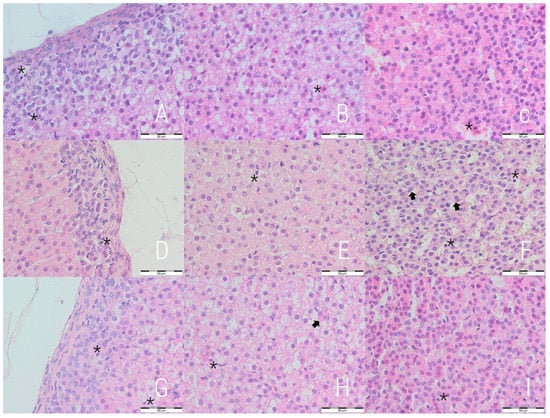 Adrenal glands 400× magnified; the control (A–C), the experimental (D–F) and reversibility control (G–I) groups. The first column shows the zona glomerulosa, second—zona fasciculata and third—zona reticularis. Differences in size and number of lipid droplets can be noted. Signs of decreased vacuolization are visible in zona fasciculata of the experimental (E) and reversibility control groups (H). Note pyknotic nuclei (*) and binucleated cells (arrow). H&E staining (bar = 50 µm).