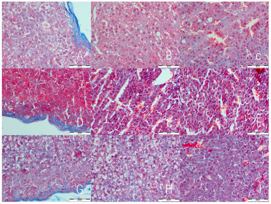 Adrenal glands 400× magnified; the control (A–C), experimental (D–F) and reversibility control (G–I) groups. The first column shows the zona glomerulosa, second—zona fasciculata and third—zona reticularis. Increased collagen deposition can be noted in zona glomerulosa and zona fasciculata of both experimental (D,E) and reversibility control (G,H) groups. Masson’s trichrome staining (bar = 50 µm).
