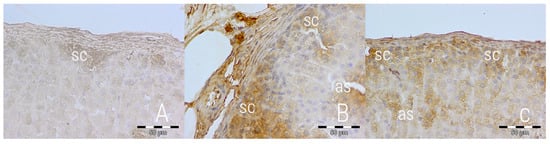 Caspase 3 expression in adrenal glands 400× magnified in the control (A), experimental (B) and reversibility control (C) groups. Visible focused subcapsular (sc) expression in zona glomerulosa and along sinusoids (as) in zona fasciculata. IHC staining (bar = 50 µm).
