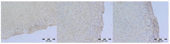 A Ki-67 immunohistochemical staining was performed to assess the mitotic activity. No significant differences in the percentage of Ki-67 positive nuclei were noted between the groups (Table 5). For further analysis of fibrosis, an immunohistochemical staining against CTGF was prepared. A significantly higher expression of CTGF was observed in both the experimental and reversibility control groups. The pigment was distributed unevenly, forming insular structures (Figure 5). The overall picture of CTGF expression matched the Masson’s trichrome.