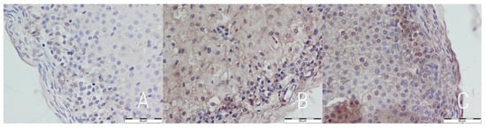 CTGF expression in adrenal glands 400× magnified in the control (A), experimental (B) and reversibility control (C) groups. Visible insular and irregular expression. IHC staining (bar = 50 µm).