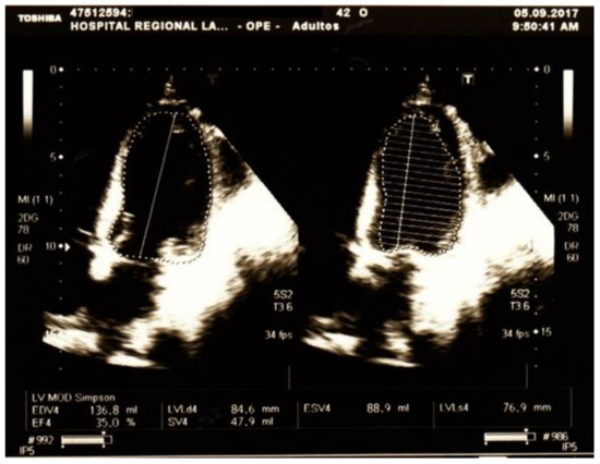 Echocardiography taken on the fifth day after admission showing borderline pulmonary artery systolic pressure (35 mm Hg), severe LV systolic dysfunction (LV ejection fraction 35%), diastolic dysfunction of restrictive type and global hypokinesia.