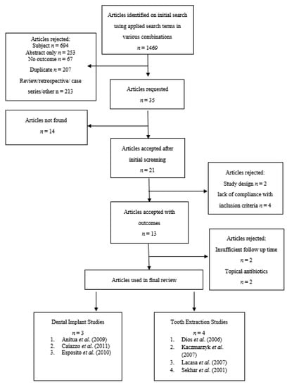 - Schwartz, A.B.; Larson, E.L. Antibiotic prophylaxis and postoperative complications after tooth extraction and implant placement: A review of the literature. J. Dent. 2007, 35, 881–888. [Google Scholar] [CrossRef] [PubMed]
