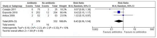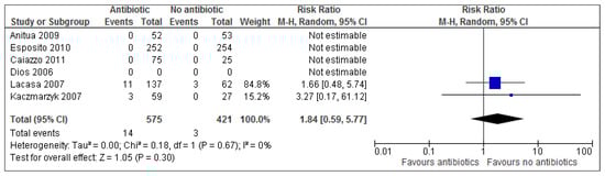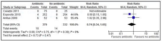 There is a minor trend showing adverse events occurring more so in the antibiotic group across the only two trials which reported any adverse events (2.43% in antibiotic group vs. 0.71% in placebo group). However, results of the present review show there is no statistical significant results for adverse events between groups (p = 0.30). Based on these results, a risk ratio of 1.84 (95% CI 0.59–5.77) implies a patient is 84% more likely to experience adverse events with treatment than adverse events without treatment.