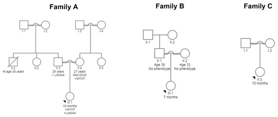 Peripheral blood samples were collected from three trios (nine individuals): three affected DCM probands and their unaffected parents from consanguineous Saudi Arabian families attending the Department of Pediatric Cardiology, MMCH, Al-Madinah, Saudi Arabia (Figure 1) [14]. Family A and B reported a family history of sudden death from “heart disease”. All patients resided in Al-Madinah, western Saudi Arabia. Probands were between 7 and 11 months of age at the time of presentation. Disease management and clinical investigations were commenced on admission, which included diagnosis of early-onset DCM by a certified cardiologist. Clinical investigations included X-ray, ECG, and echocardiography. Other cardiac or systemic causes of DCM including coronary and valvular diseases were ruled out.