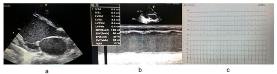 In Family A, the proband presented at 10 months of age with symptoms and signs of decompensated heart failure. Echocardiography revealed a severe form of DCM with marked systolic and diastolic dysfunction, left ventricle end-diastolic diameter (LVED) of 120 cm, left ventricular end systolic diameter (LVES) of 0.4 cm, a low left ventricular ejection fraction (LVEF) of 25%, and left ventricular posterior wall thickness of 0.4 cm (Figure 2a,b). ECGs revealed normal sinus tachycardia, a heart rate of 140 beats/min, a normal axis, and a widened QRS complex (>110 ms) possibly indicating a left bundle branch block (Figure 2c). For families B and C, probands were also diagnosed with DCM. In Family B, the proband presented at 7 months of age with symptoms and signs of heart failure. Echocardiography revealed DCM with marked systolic and diastolic dysfunction, enlarged left ventricle (LVED 117 cm, LVES 0.35 cm), a low LVEF of 22%, and left ventricular posterior wall thickness of 0.3 cm. ECGs revealed normal sinus tachycardia, a heart rate of 138 beats/min, a normal axis, and a widened QRS complex (>110 ms). In Family C, the proband presented at 10 months of age with symptoms and signs of heart failure. Echocardiography revealed DCM with marked systolic and diastolic dysfunction, enlarged left ventricle (LVED 110 cm, LVES 0.3 cm), a low LVEF of 19%, and left ventricular posterior wall thickness of 0.27 cm. ECGs revealed normal sinus tachycardia, a heart rate of 140 beats/min, a normal axis, and a widened QRS complex (>105 ms). Symptoms of metabolic disorders were completely absent in all probands.