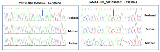 Sanger sequencing of the Family A trio. The MYH7 p.E924K mutation was present in the heterozygous state in the case and mildly affected mother. The LAMA4 p.Asp1309Asn variant was present in the heterozygous state in the case and unaffected father. Variants are indicated with arrows.