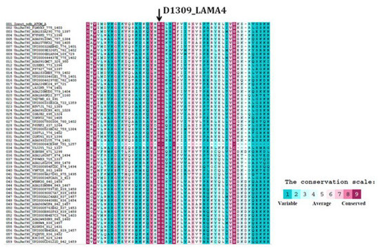 The second missense variant was a novel variant in LAMA4 (NM_001105206.2: c.3925G > A, p.Asp1309Asn, which was not present in any control databases including gnomAD, GME Variome, and dbSNP or the Atlas of Cardiac Genetic Variation, and in disease databases such as ClinVar and the Atlas of Cardiac Genetic Variation. This suggests that it may be a “private” variant in this family. The variant changes an acidic aspartic acid to a neutral polar uncharged asparagine in the laminin G-like 3 domain. ConSurf analysis showed that the aspartic acid at codon 1309 had a conservation score of 9, meaning that the residue is highly evolutionarily conserved (Figure 4). In silico analysis using SIFT, MutationTaster, and Polyphen-2 predicted that the LAMA4 p.Asp1309Asn variant was “damaging”. Based on the above data and following the ACMG and ACGS variant classification guidelines, we classified the novel LAMA4 p.Asp1309Asn variant as “likely pathogenic” based on three evidences (PM1, PM2, PP3, PP4). However, automated classification software, such as VarSome (https://varsome.com), assigned a classification of “variant of unknown significance (VUS) based on two evidences (PM2 and PP3). The MYH7 p.Glu924Lys variant is well described and classified as pathogenic in ClinVar and the Atlas of Cardiac Genetic Variation.