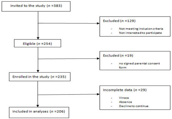 This cross-sectional study was conducted in 10–12-year-old boys in the center of Ardabil Province, North West of Iran, during 2015 and 2016. Due to sociocultural reasons, only boys were included in the sample. Three schools were selected randomly from a list of public schools. Fifteen classes were then randomly selected from a list of fourth, fifth, and sixth grades and 383 students within these classes were invited to participate. Participants were excluded if they presented musculoskeletal problems or chronic diseases, were using medications or were not interested in participating (129 participants were excluded). Participants provided verbal consent and presented written consent by their parents. Most of the students were interested in participating in the study and completing the tests (participation rate = 84%), except for nineteen participants who did not present the signed written consent and therefore were not included. Finally, data from twenty-nine participants who did not complete all measurements were excluded from the analyses (Figure 1).