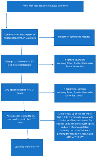 - Kirchhof, P.; Blank, B.F.; Calvert, M.; Camm, A.J.; Chlouverakis, G.; Diener, H.-C.; Goette, A.; Huening, A.; Lip, G.Y.H.; Simantirakis, E.; et al. Probing oral anticoagulation in patients with atrial high rate episodes: Rationale and design of the Non-Vitamin K antagonist Oral anticoagulants in patients with Atrial High rate episodes (NOAH–AFNET 6) trial. Am. Heart J. 2017, 190, 12–18. [Google Scholar] [CrossRef] [PubMed]