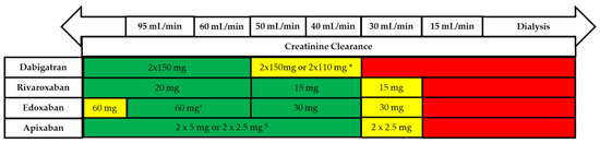 - Kimachi, M.; Furukawa, T.A.; Kimachi, K.; Goto, Y.; Fukuma, S.; Fukuhara, S. Direct oral anticoagulants versus warfarin for preventing stroke and systemic embolic events among atrial fibrillation patients with chronic kidney disease. Cochrane Database Syst. Rev. 2017, 11, CD011373. [Google Scholar] [CrossRef]