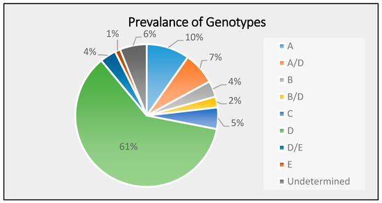 Prevalence of HBV genotypes among 82 patients under study in the Kingdom of Bahrain.