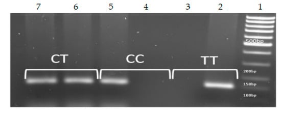 Polymorphism rs12979860—determination of genotypes (size of PCR product: 153 bp). Line 1, DNA ladder; lanes 2,3, TT homozygous; lanes 4,5, CC homozygous, Lines 6,7, CT heterozygous. Heterozygous samples resulted in the amplification of both bands, indicating the presence of the two alleles.