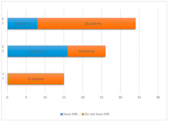 IL28B genotype distribution according to the clinical manifestation of recurrent herpes simplex virus (HSV) infection. Patients with herpes simplex keratitis (HSK) are marked in blue, and patients without HSK are marked in orange.