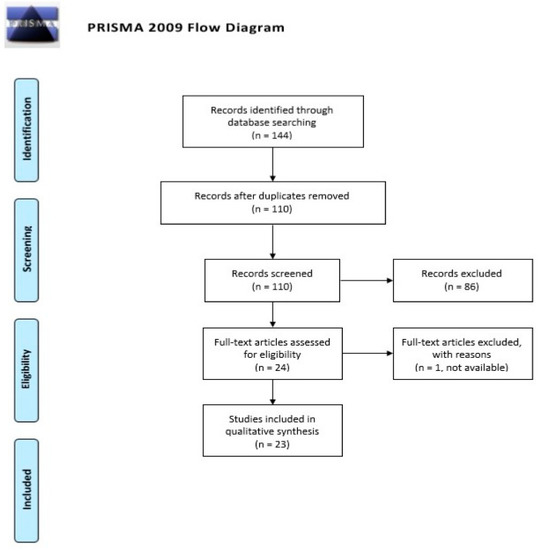 The search retrieved 144 references; 24 full text articles were assessed for eligibility (see Figure 1 for the flow diagram); 1 full text article was not available for the assessment. We eventually included 23 published studies in the review.