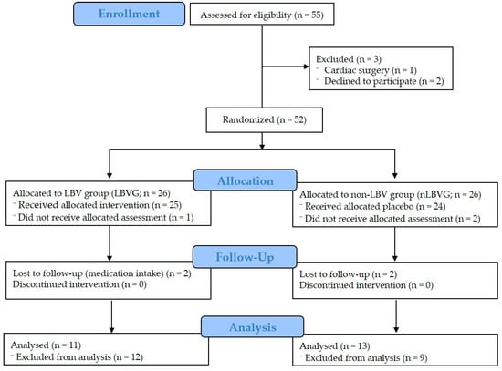 This study took place in a research center from 1 December 2017 to 6 February 2018. The first assessment was conducted from 1 to 2 December 2017, the second assessment from 2 to 3 January 2018, and the last assessment from 5 to 6 February 2018. Participants were recruited through the recommendation of a surgeon familiar with LBV. Prior to the study, participants received detailed explanations regarding the study procedures and were then asked to complete questions. The included criteria required that participants underwent an ACL reconstruction no more than seven days before the start of the study. Participants were evaluated by clinical and radiological criteria, level of knee pain during the past month, and pain or difficulty in standing from a sitting position or climbing stairs []. All participants were patients who did not exercise regularly for over six months. Additionally, participants were also included if they had not received treatment/medication for weight loss or anything known to affect body composition, and if they did not have any internal metallic materials. The participants’ mean (SD) age was 29.25 (14.51) years. After excluding three participants (one had cardiac surgery three years prior and two refused to participate because their homes were too far from the hospital or research center) of fifty-five eligible participants, the remaining fifty-two participants belonged to one of two groups by lot and were randomly allocated to each group as shown in Figure 1. Of the 26 participants in the experimental group who were allocated to the LBV group (LBVG), one did not receive the assessment, two were lost in the follow-up phase, eight underwent arthroscopic surgery for complex injuries to their ACL or posterior cruciate ligament, and four underwent ACL arthroplasty. Therefore, eleven participants of the LBVG who underwent ACL reconstruction were analyzed in our study. Furthermore, of the 26 patients in the control group who were allocated to the non-LBV group (nLBVG), two did not receive the assessment, two were lost in the follow-up phase, and nine underwent arthroscopic surgery with a simple ACL rupture. Therefore, thirteen participants in the nLBVG who underwent ACL reconstruction were analyzed in our study. Exclusion criteria consisted of having a history of impairment of a major organ system or psychiatric disease. Participants with tumors, vascular inflammation, or kidney stones were also excluded. The LBVG received vibroacoustic pulses, whereas the nLBVG received massages by a VAST device without vibroacoustic pulses as a placebo. This study investigated psychological measures such as pain, anxiety, and symptoms; and physiological measures such as systolic blood pressure (SBP), diastolic blood pressure (DBP), heart rate (HR), breathing rate (BR), sympathetic activation (SA), parasympathetic activation (PSA), range of motion (ROM), and isokinetic peak torque (PT) in the quadriceps and hamstrings at Weeks 0, 4, and 8. Finally, twenty-four participants were interviewed and informed about the rehabilitation program they would receive. As shown in Figure 1, the participants were allocated as follows: LBVG (n = 11) and nLBV (n = 13). All participants were assigned using random number tables and assigned identification numbers upon recruitment. Participant characteristics, which indicate homogeneity, are presented in Table 1.
