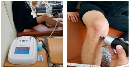 Participants performed workout sessions with Evocell (Shinoo Medison, Gangwon-do, Korea; Figure 2). The vibration patterns of Evocell are consistent and have a wide range of sound waves that change frequency according to the flow of music. This device has a maximal impulse of 1658 Hz, which has been developed to reduce pain by delivering stimuli below the skin. To reduce the friction of skin caused by equipment and to relieve pain, an exogenous gel (menthol-based material) was used with a starting impulse intensity at 20% of the maximum impulse for 30 min, similar to protocols from Lundeberg and colleagues [].