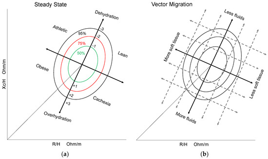 Bioelectrical impedance vector analysis (BIVA) steady state quadrants and vector migration according to hydration status and soft tissues content: (a) BIVA steady state quadrants; (b) BIVA vector migration. Optimal body composition is located at the center (50% and 75% ellipses). Vector migration to a certain direction represents a modification in the patient’s soft tissue/hydration status. Figure redrawn, adapted and modified [5,8].