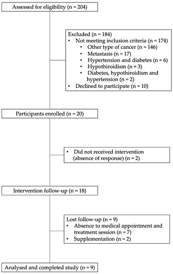 During the recruiting period, all 204 subjects who attended the CEO and were about to start antineoplastic treatment were contacted. Thirty participants met the inclusion criteria, but only 20 were enrolled in the study and 9 completed the 6-month nutrition intervention for quantitative and qualitative analysis, which meets the aforementioned sample size (Figure 2).