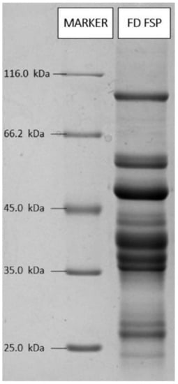 SDS-PAGE (sodium dodecyl sulphate-polyacrylamide gel electrophoresis technique) is commonly used technique for characterization of proteins. Molecular weight distrubition of FSP were determined. As illustrated in Figure 1, with molecular weights (MW) ranging from 23 to 94 kDa were observed and it was identified that the 3840 and 48 kDa patterns were the most intense ones. These observations are mainly consistent with other studies [,]
