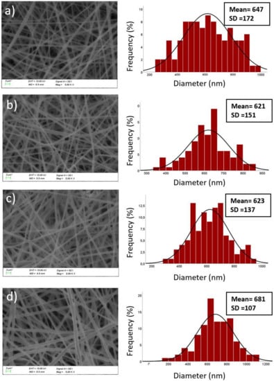 The morphologies of the electrospun fibers were examined using a scanning electron microscope(SEM) (EVA MA 10, Zeiss, San Diego, CA, USA) at an accelerating voltage of 10 kV. Samples were coated with gold/palladium (18 nm) using a sputter coater (SC7620, Quorum, Lewes, UK). The average fiber diameters and their distribution were determined by the image analysis software (SmartSEM, Zeiss, San Diego, CA, USA) using the measurement of 100 fibers selected randomly from each sample.