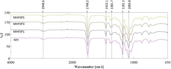 Fourier-transform infrared spectroscopy (FTIR) spectra of the MH, MHFSP1, MHFSP3 and MHFSP5 nanofiber samples.