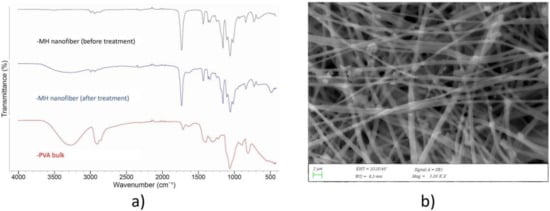 (a) FTIR spectra of PVA bulk, MH nanofiber before and after phosphate buffer solution (PBS) treatment; (b) Scanning electron microscopy (SEM) image of the MH nanofiber after the PBS treatment.