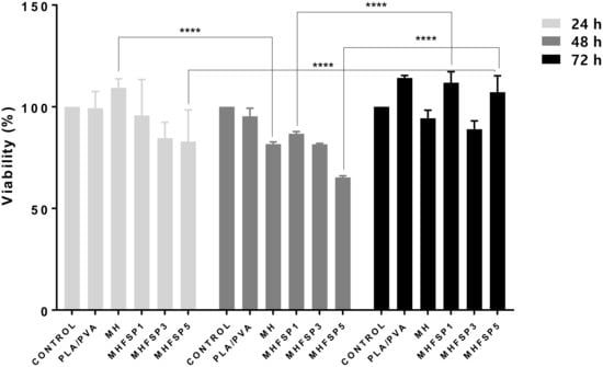 In vitro cytotoxicity assay of PLA/PVA, MH, MHFSP1, MHFSP3 and MHFSP5 samples. Values are the mean standard deviation of three experiments. **** p < 0.001 vs. day groups.