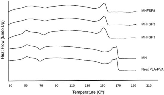 Differential scanning calorimetry (DSC) curves of Neat PLA-PVA, MH, MHFSP1, MHFSP3 and MHFSP5 nanofiber samples.