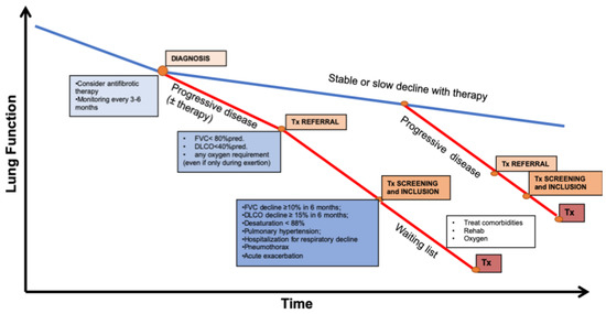 Representation of the steps for the transplant process throughout the natural history of patients with idiopathic pulmonary fibrosis. Tx = transplantation, FVC = forced vital capacity, DLCO = diffusion capacity of the lung for carbon monoxide.