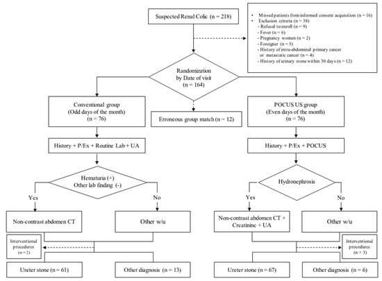 In recent decades, point-of-care ultrasonography (POCUS) has been increasingly used by emergency physicians because of its easy bedside applicability without radiation exposure. Thus, POCUS can be extremely useful for the evaluation of patients with critical conditions visiting the ED [,]. Detecting hydronephrosis by ultrasonography is an indirect sign for ureter stone, which has a reliable sensitivity and specificity for the diagnosis of renal colic [,,,,,,,]. The importance of POCUS in evaluating patients with renal colic is being increasingly recognized [,]. However, only a few ultrasonography algorithms for managing patients suspected with ureter stone exist [,,,,].