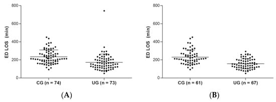 The ED length of stay was significantly lower in the UG group compared to the CG group. The difference in the length of stay between the CG and UG group was 62 min (UG 172 min (95% CI): 151–194 min] vs. CG 234 min (95% CI 216–252 min), p-value for difference <0.001). The subgroup diagnosed as ureter stone in the UG group showed meaningful distinction in terms of length of stay compared with the CG group, 74 min (UG 157 min (95% CI 144–171 min) vs. CG 231 min (211–251 min), p -value for difference <0.001 (Figure 2 and Table 2).
