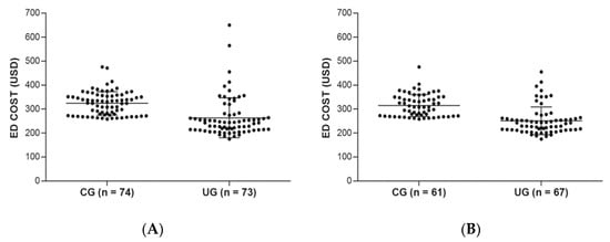 Medical cost was significantly lower in the UG than in the CG. The difference in medical cost between the CG and UG at the ED discharge for diagnosing ureter stone was approximately 60 USD (UG 259 (95% CI 240–278) vs. CG 319 (CG 319 USD) USD; p < 0.001), and the difference in the subgroup of diagnosed with ureter stone was 63 USD (UG 247 (95% CI 233–260) USD vs. CG 310 (95% CI 298–322) USD; p < 0.001) (Figure 3 and Table 2). However, the time from performing CT scan to ED discharge was not significantly different between the CG and UG. Also, there was no significant difference in 30-day complications and missed diagnosis between the CG and UG groups (Table 2).