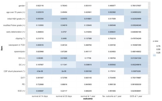 Statistical significance of potential predictors of outcome in 176 patients with aneurysmal subarachnoid hemorrhage as estimated from generalized linear models for dichotomous outcome variables (survival and fav. outcome) and proportional odds logistic regression for an ordinal outcome variable (GOS) after aneurysmal subarachnoid hemorrhage. Information on survival at Days 14 and 30 after the hemorrhage was available in all patients, while information on outcome at one year after the hemorrhage was obtained in 133 patients (75.6%). Abbreviations: H&H, Hunt and Hess; TCD, transcranial Doppler sonography; DCI, delayed cerebral ischemia; DC, decompressive craniectomy; CSF, cerebrospinal fluid; DVT, deep vein thrombosis; PE, pulmonary embolism; SCE, severe cardiac event; fav., favorable; GOS, Glasgow Outcome Scale; (*) true (dichotomous variables) or increasing (ordered values) values predictive of survival, favorable outcome, or high GOS score; (+) true (dichotomous variables) or increasing (ordered values) values predictive of mortality, unfavorable outcome or low GOS score.