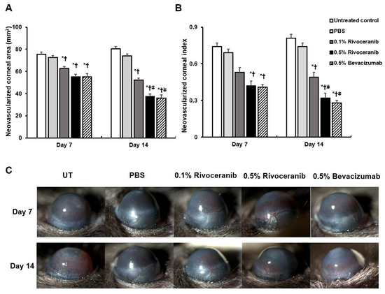 Comparison of the (a) area of corneal neovasculariziation (CNV) and (b) CNV index in the untreated (UT) control group, phosphate-buffered saline (PBS) group, and groups treated with 0.1% rivoceranib, 0.5% rivoceranib, and 0.5% bevacizumab. (c) Representative images of the groups. * p < 0.05 compared with the control; † p < 0.05 compared with the PBS group; ‡ p < 0.05 compared with the group treated with 0.1% rivoceranib.