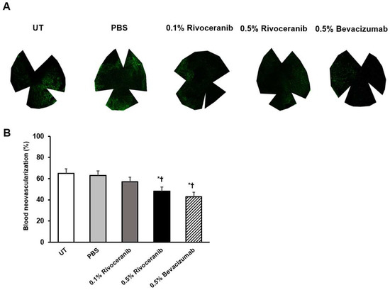 Percentage of blood neovascularization as measured by immunofluorescence staining of CD31. (a) Representative images of the UT and PBS groups and groups treated with 0.1% rivoceranib, 0.5% rivoceranib, and 0.5% bevacizumab. (b) The percentages of blood neovascularization are compared graphically. * p < 0.05 compared with the control; † p < 0.05 compared with the PBS group.