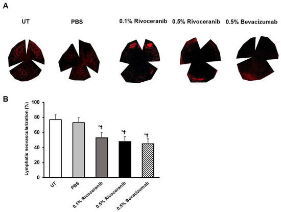 Percentage of lymphatic neovascularization as measured by immunofluorescence staining of LYVE1. (a) Representative images of the UT and PBS groups and groups treated with 0.1% rivoceranib, 0.5% rivoceranib, and 0.5% bevacizumab. (b) The percentages of lymphatic neovascularization are compared graphically. * p < 0.05 compared with the control; † p < 0.05 compared with the PBS group.