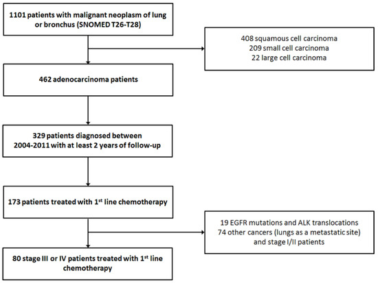 First step of filtering the identified patient cohort was to identify the patients with lung adenocarcinoma. Only patients who were diagnosed before the year 2011 were included; thus, every patient could be followed for two years or until death (Figure 1). These patients were then cross-referenced with the hospital registry on chemotherapy regimens.